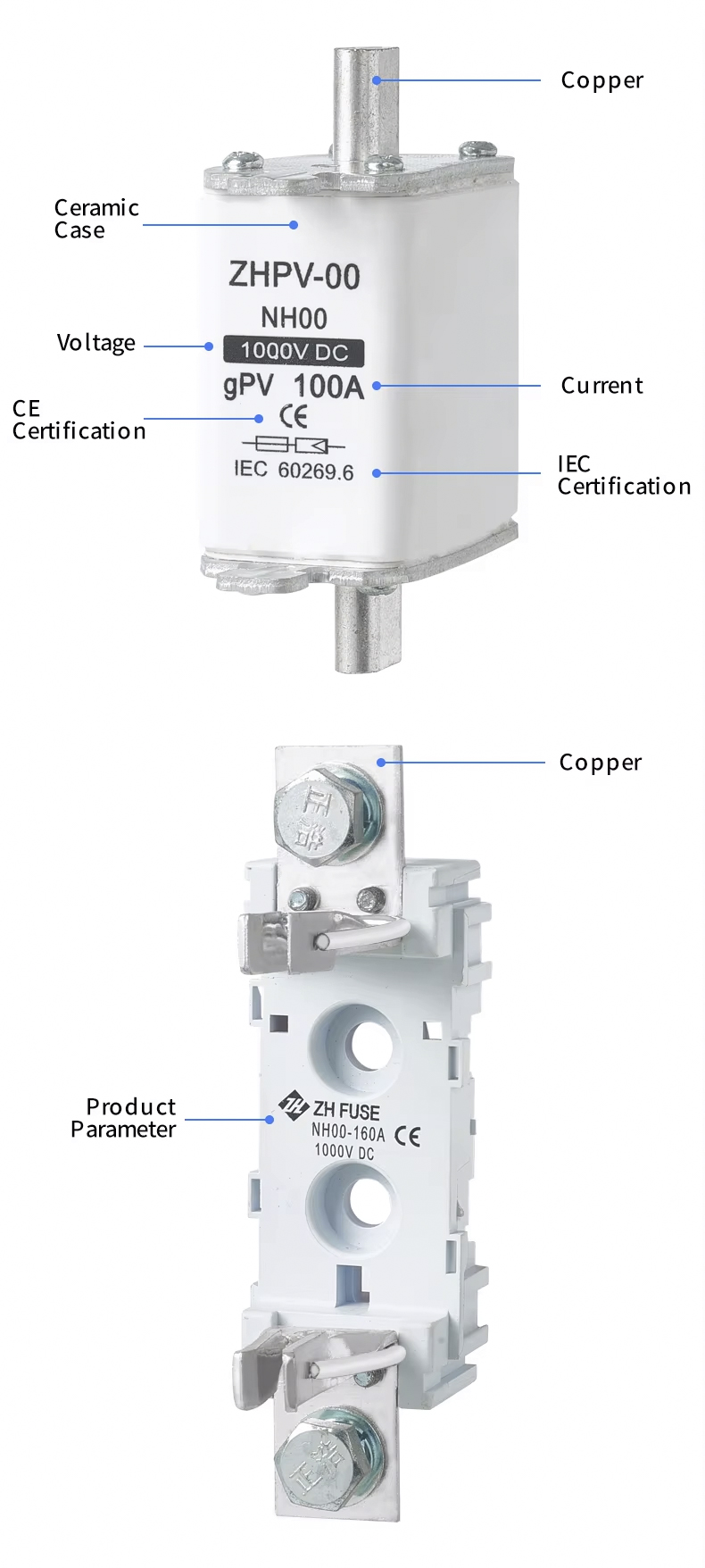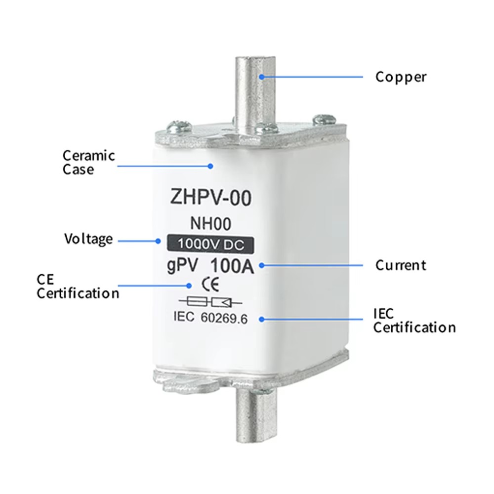 NH00 Fotovoltaik Sistemi DC 1000V 32~100A Sigorta Bağlantısı fotovoltaik DC sistemlərində həddindən artıq cərəyandan qorunmaq üçün uyğundur. Bu məhsul maksimum 1000V DC gərginliyini və 32~100A cərəyan diapazonunu dəstəkləyir. O, xüsusi olaraq günəş elektrik stansiyaları və enerji saxlama sistemləri üçün nəzərdə tutulmuşdur və həddindən artıq yüklənmə və ya qısaqapanma nəticəsində yaranan avadanlığın zədələnməsinin qarşısını effektiv şəkildə ala bilir.