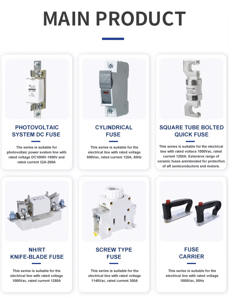 NH00 Fotovoltaik Sistem DC 1000V 32~100A Sigorta Bağlantısı Sabit və etibarlı qoruyucu xüsusiyyətlərini, sürətli reaksiya sürətini və yüksək təhlükəsizliyi təmin etmək üçün yüksək keyfiyyətli materiallar seçilmişdir. Görünüşünə görə yığcam, quraşdırılması asan, fotovoltaik kombin qutuları, çeviricilər və DC paylayıcı şkaflar kimi müxtəlif sistemlərdə geniş istifadə olunur. NH00 Fotovoltaik Sistemi DC 1000V 32~100A Fuse Link bir çox beynəlxalq sertifikatlardan keçmiş və IEC standartlarına uyğundur, bu da onu elektrik stansiyası sistemlərinin təhlükəsiz istismarını təmin etmək üçün ideal seçim edir.